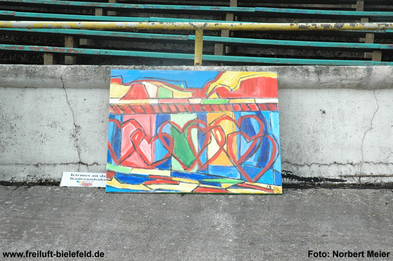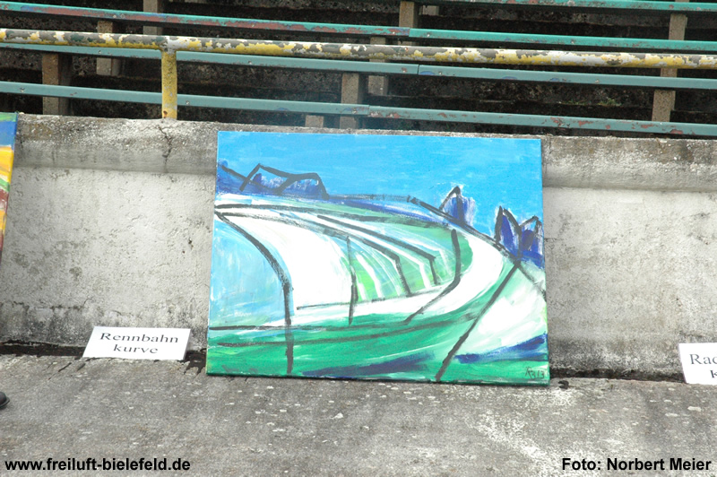 malte in Acryl und nahm dabei die charakteristischen Formen der Radrennbahn auf, Sie versuchte, Historisches und Veranstaltungen auf dem Gelände einzuarbeiten.