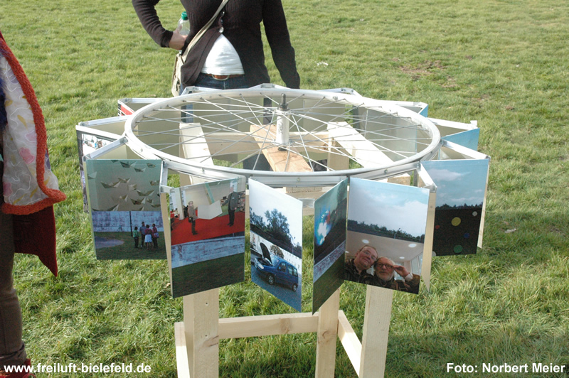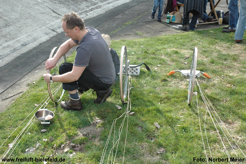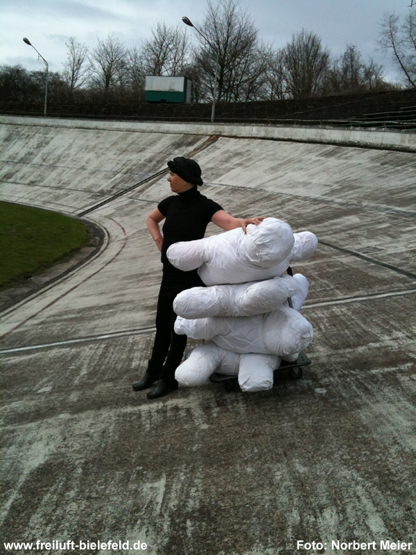 Gereon Inger zeigte eine Aktion, die auf die Teilnahme vieler BesucherInnen setzte: auf der Radrennbahn entstand eine riesige Fahrradzeichnung aus Fahrrädern.