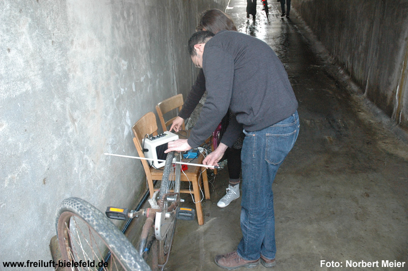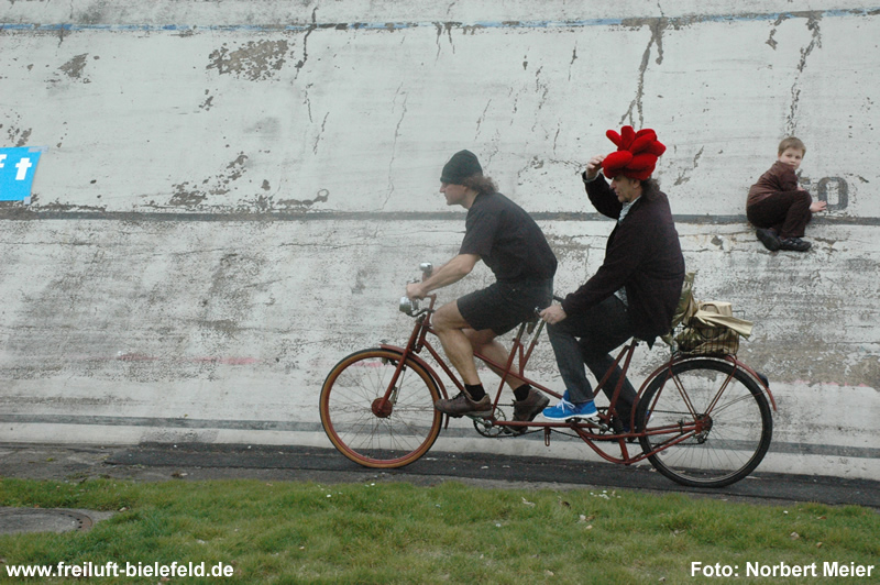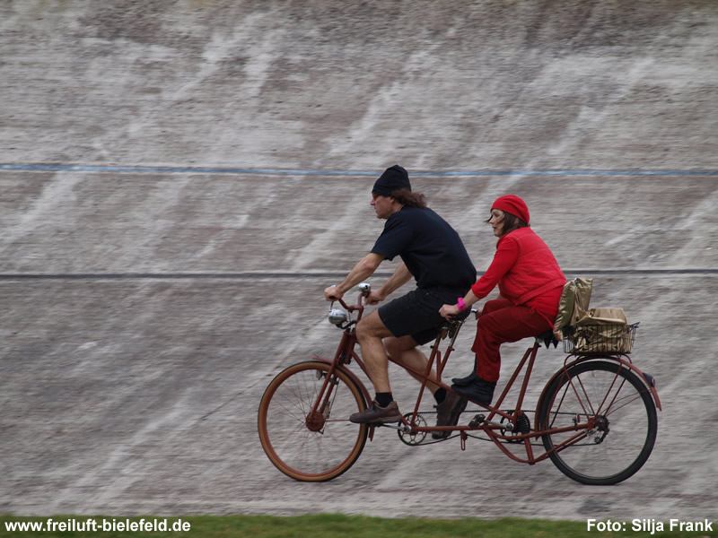 Beim Steherrennen 2012 auf der Radrennbahn fiel mir mein historisches Tandem (Jahrgang 1950 oder so) ein. Ich wollte es zu freiluft auf die Radrennbahn ausführen und heuerte für einen Stundenlohn von 10 € Michael Metzger als Fahrer an. Es wurde daraus die Aktion „für 10 € Mindestlohn“ in schwarz-rot-gold.