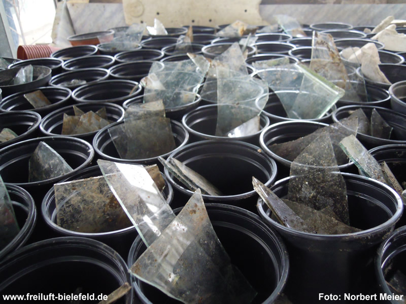 - „Scherbennester“ (I, II, III, IV) (Glasscherben, Kunstblumen, Wäscheklammern, Wodkaflaschen) und die Installation