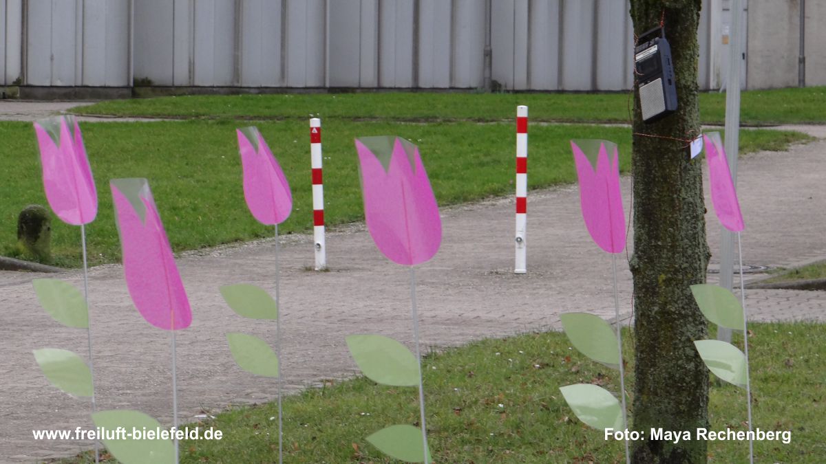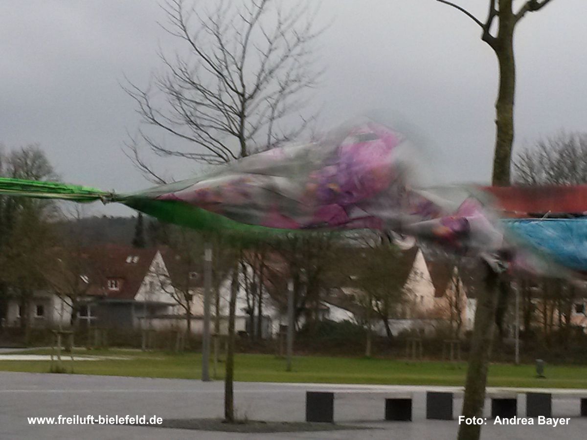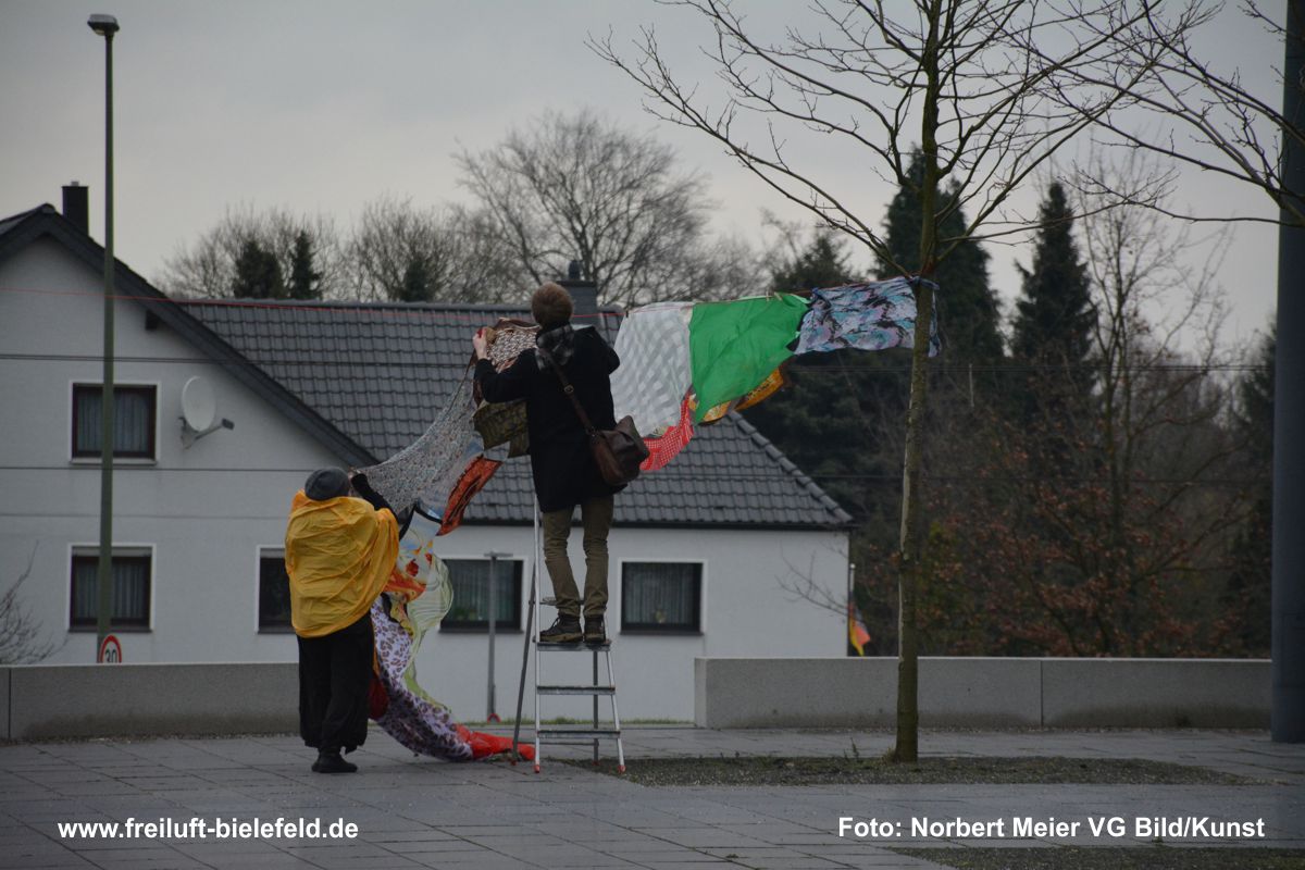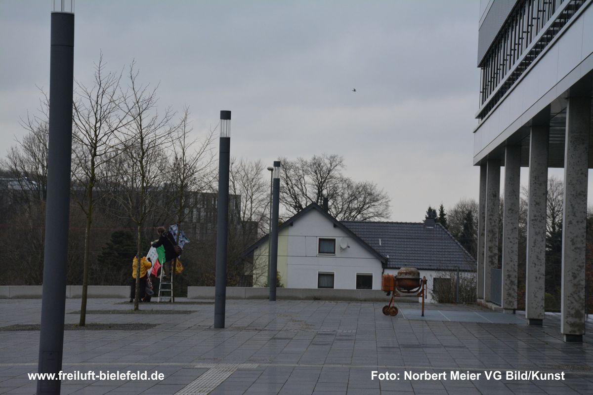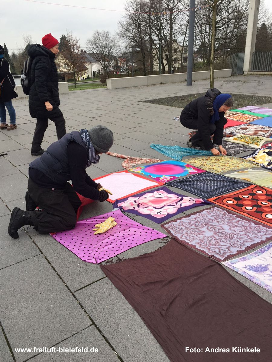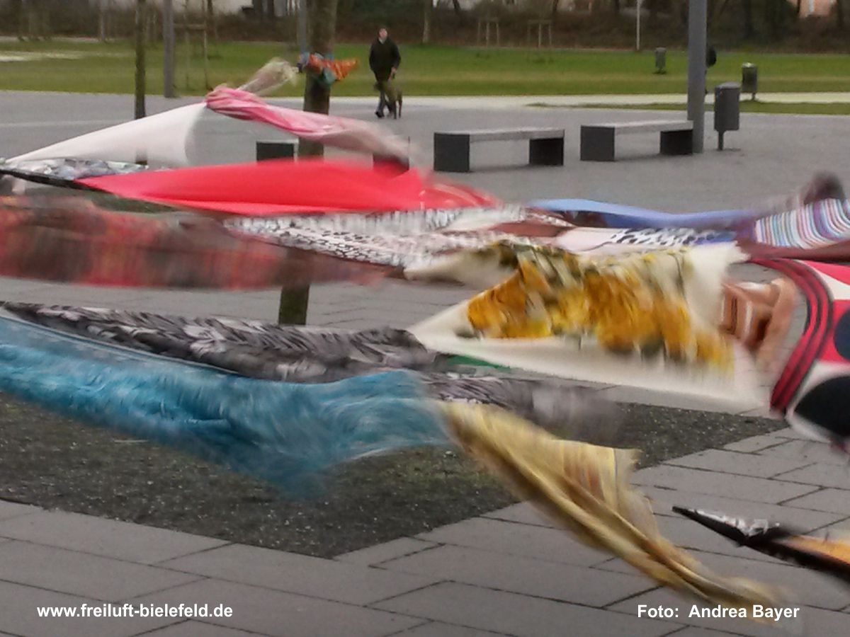 Mitmachprojekt: 100 Kopftücher und mehr werden auf dem „sozialen Feld“ der Universität Bielefeld miteinander verknüpft und bewegt: größere, kleinere, alle bunt und eins schöner als das andere. Je nach Wetterlage dürfen sie im Wind herum flattern oder sich sanft auf dem Boden bewegen.
