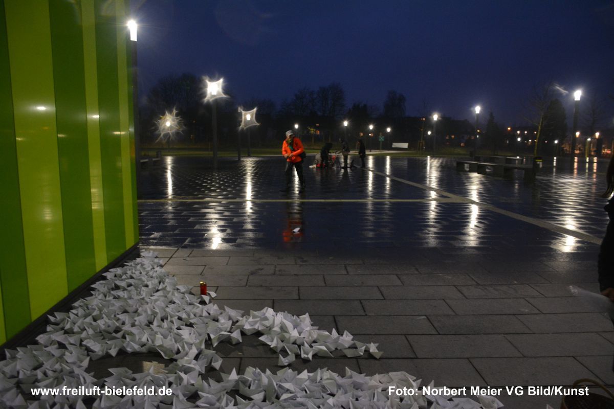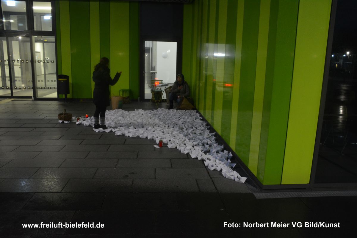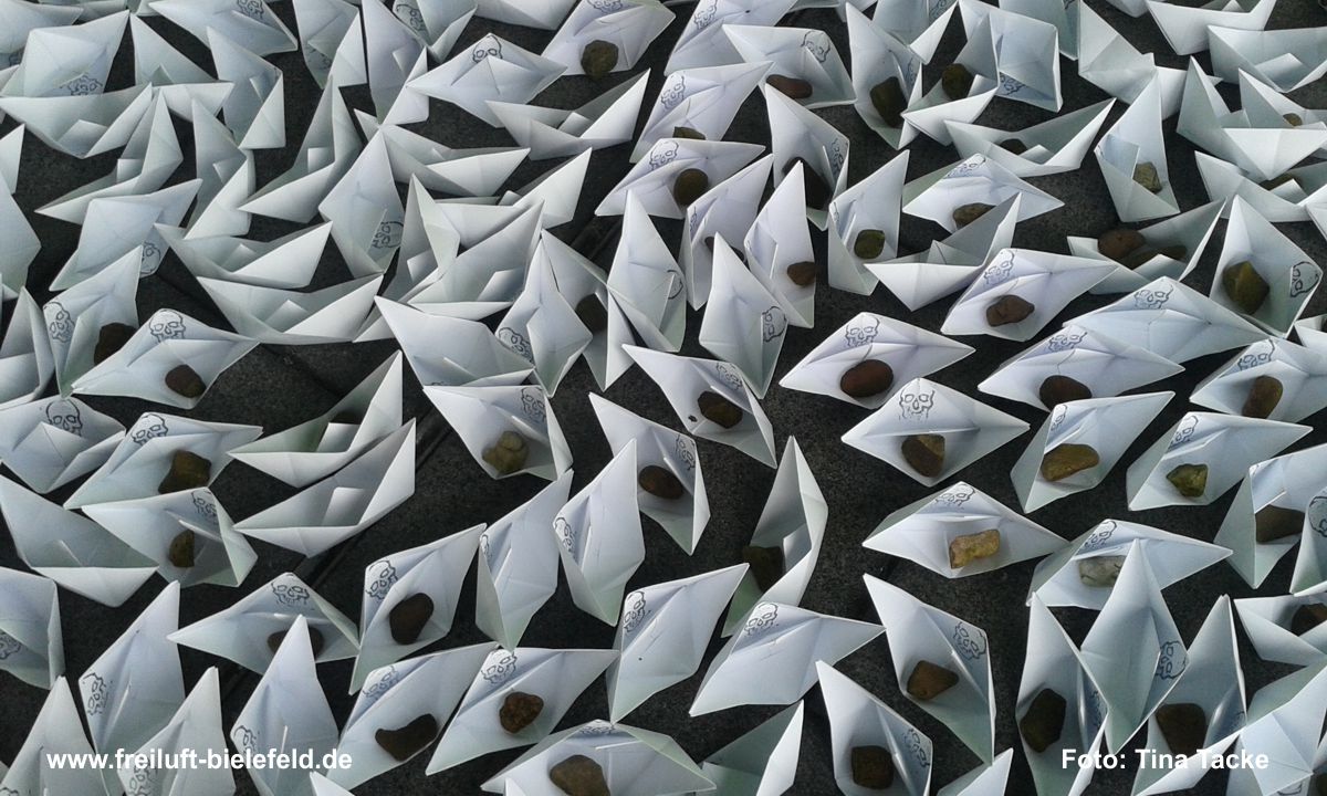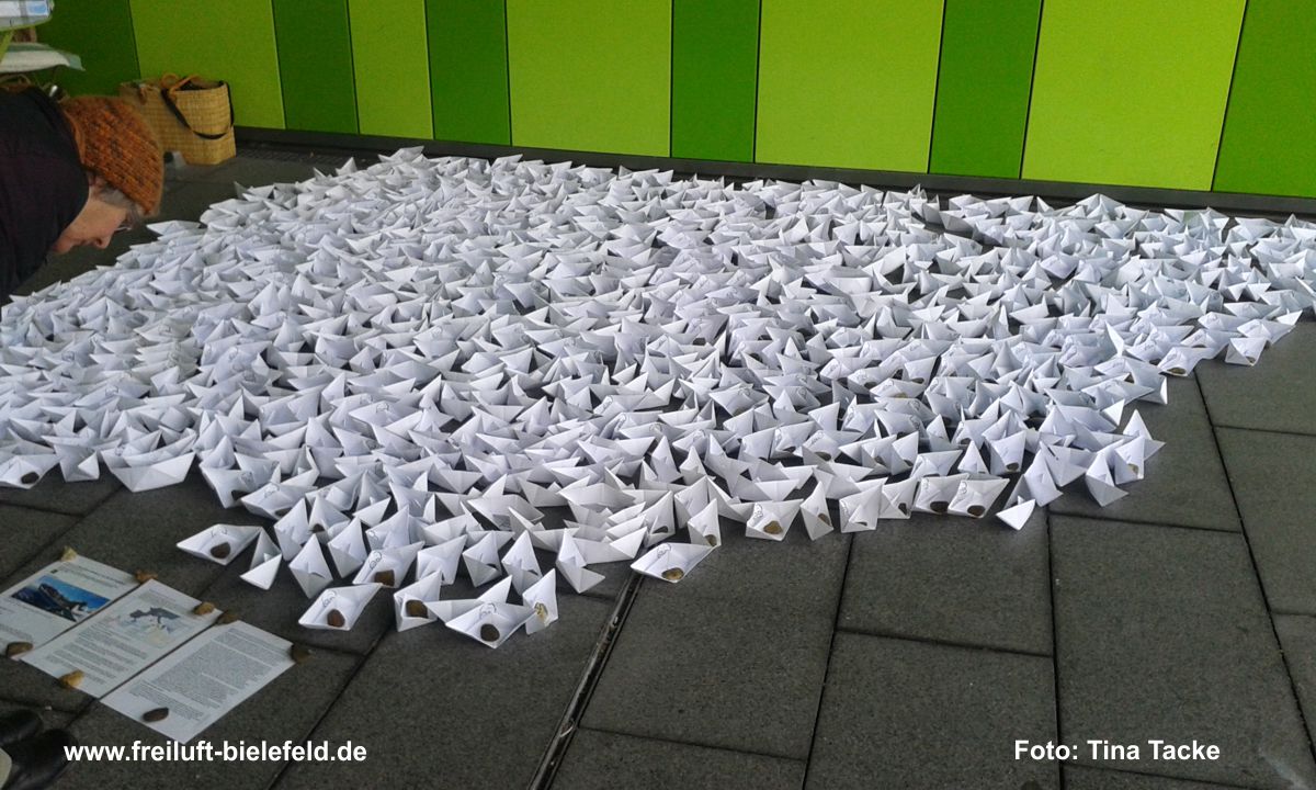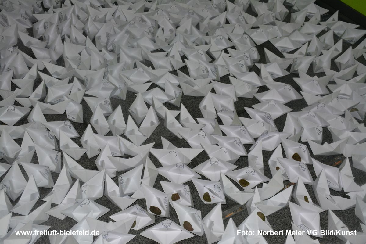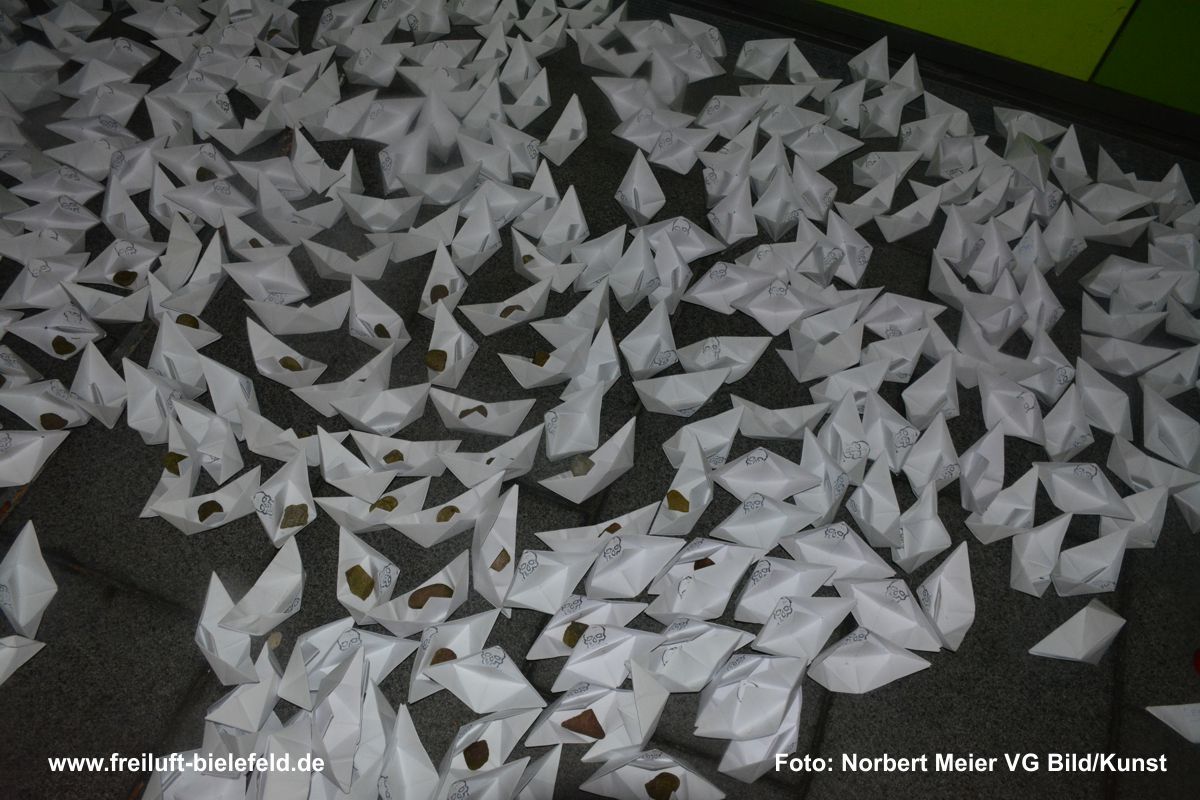 Die Instalation, der 1000 Boote, hat sich bei der Realisierung, verändert. Die Boote werden nicht aus Zeitungspapier, sondern