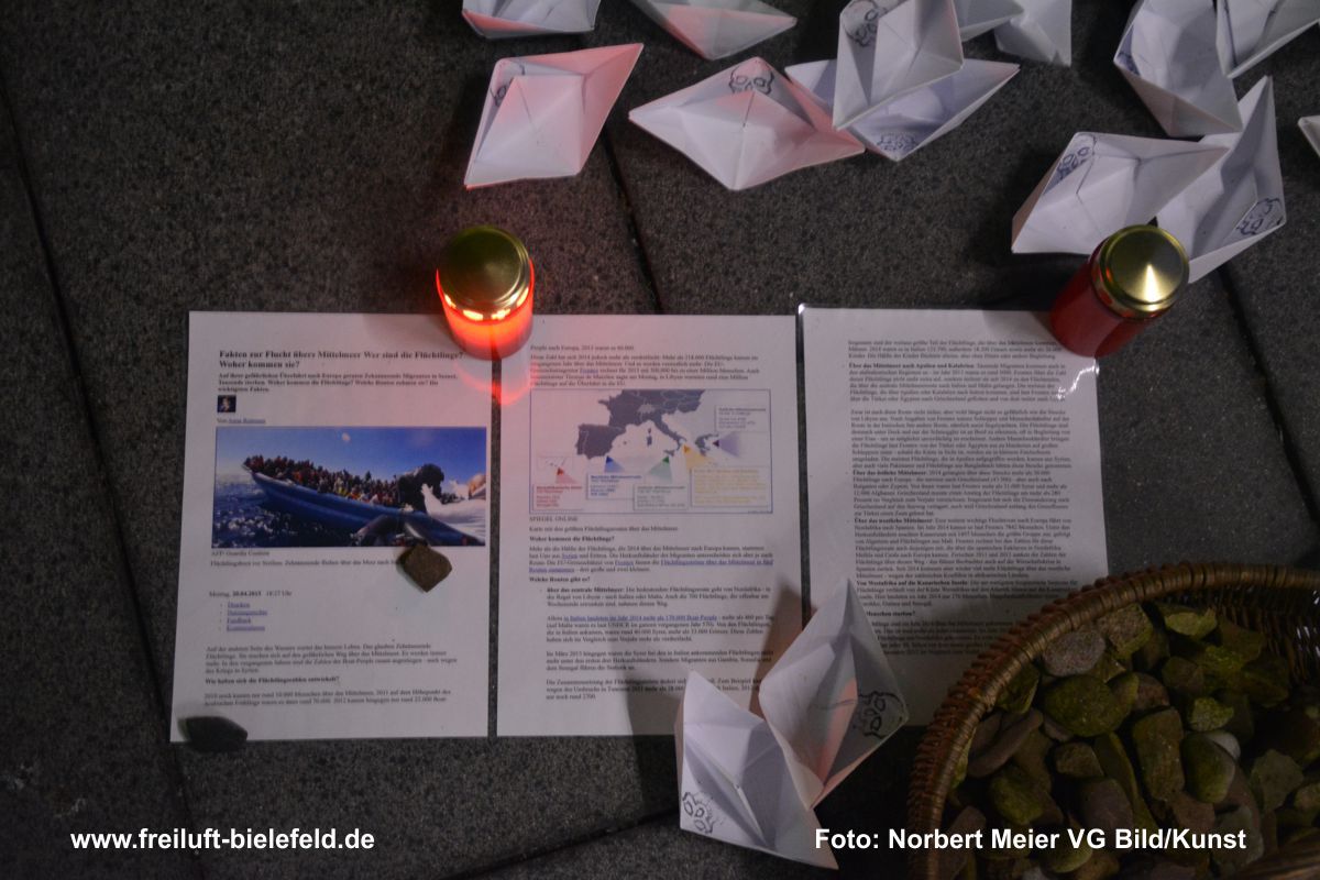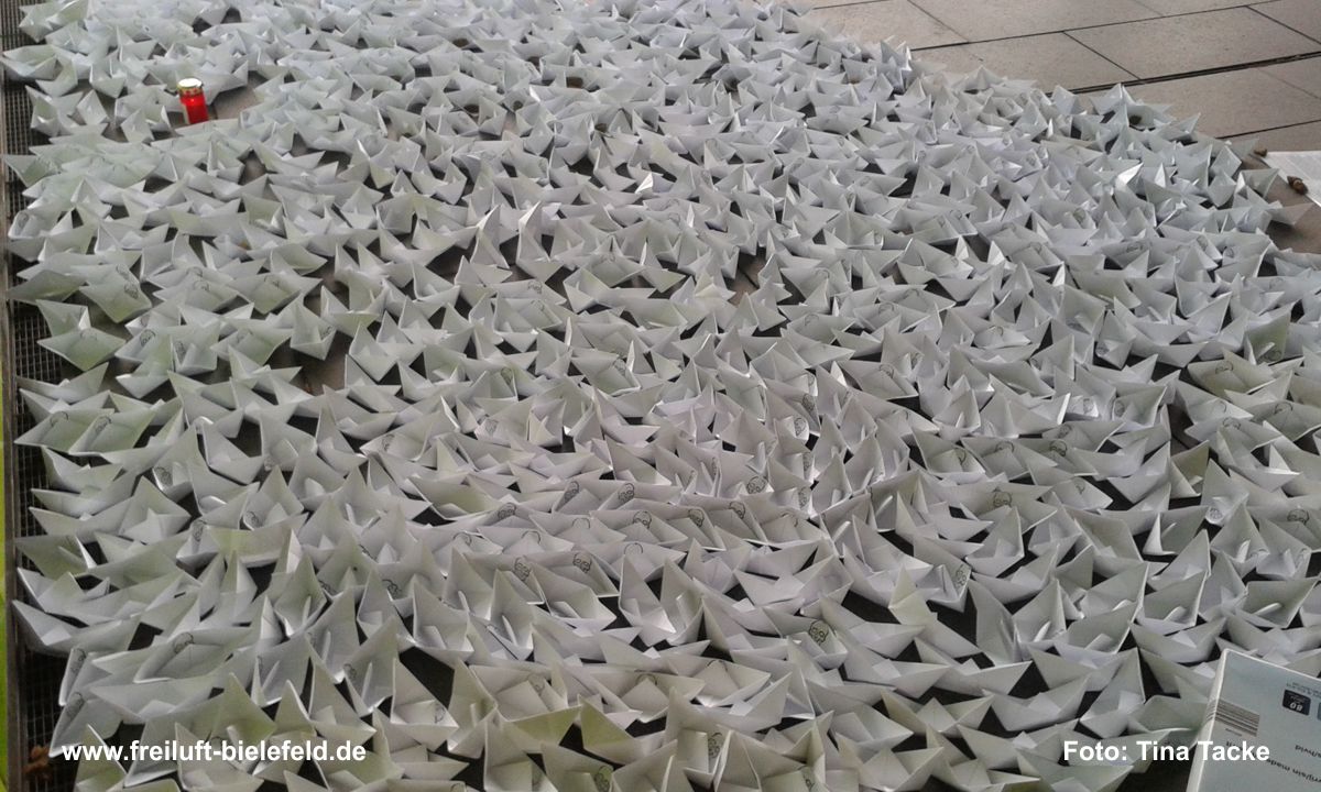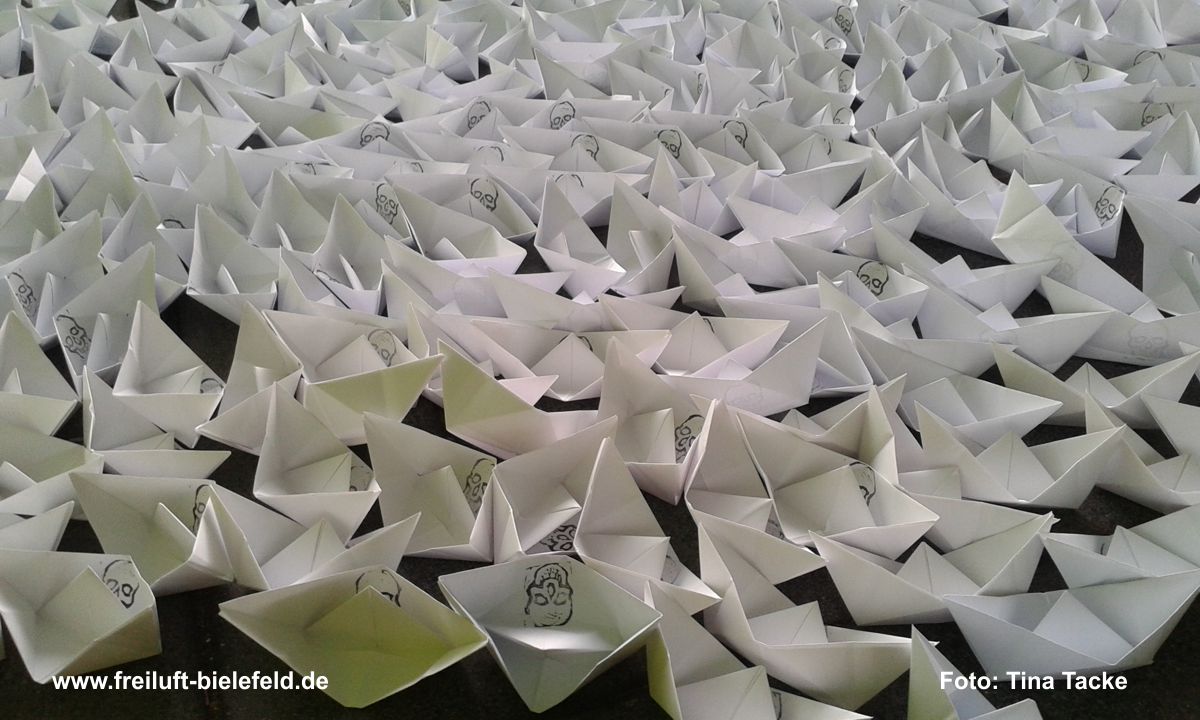 Faltet1000 Zeitungspapierschiffchen, um an die im Meer versunkenen Bootsflüchtlinge zu erinnern.